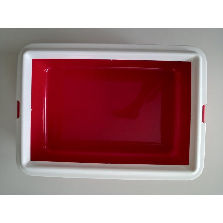 Тоалет за мачки, отворен со дополнителен заштитнен браник кој спречува расфрлање на песокот.