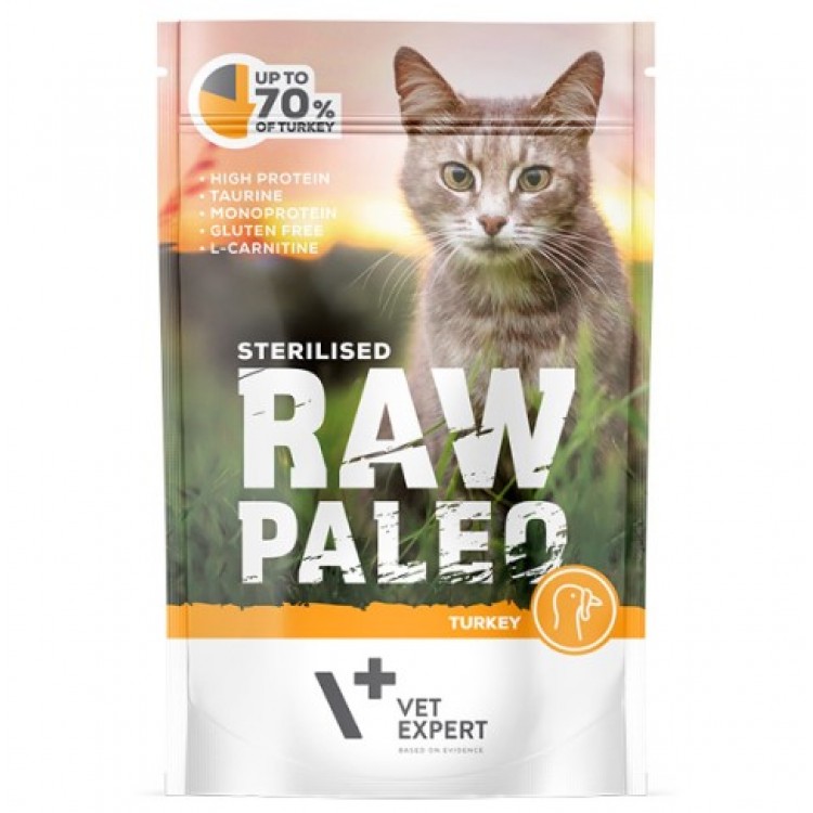 RAW PALEO Стерилизирана влажна храна за мачки е комплетна и избалансирана храна за одржување на возрасни мачки со предиспозиција за прекумерна тежина или дебелина, како и за стерилизирани мачки и кастрирани мачори.